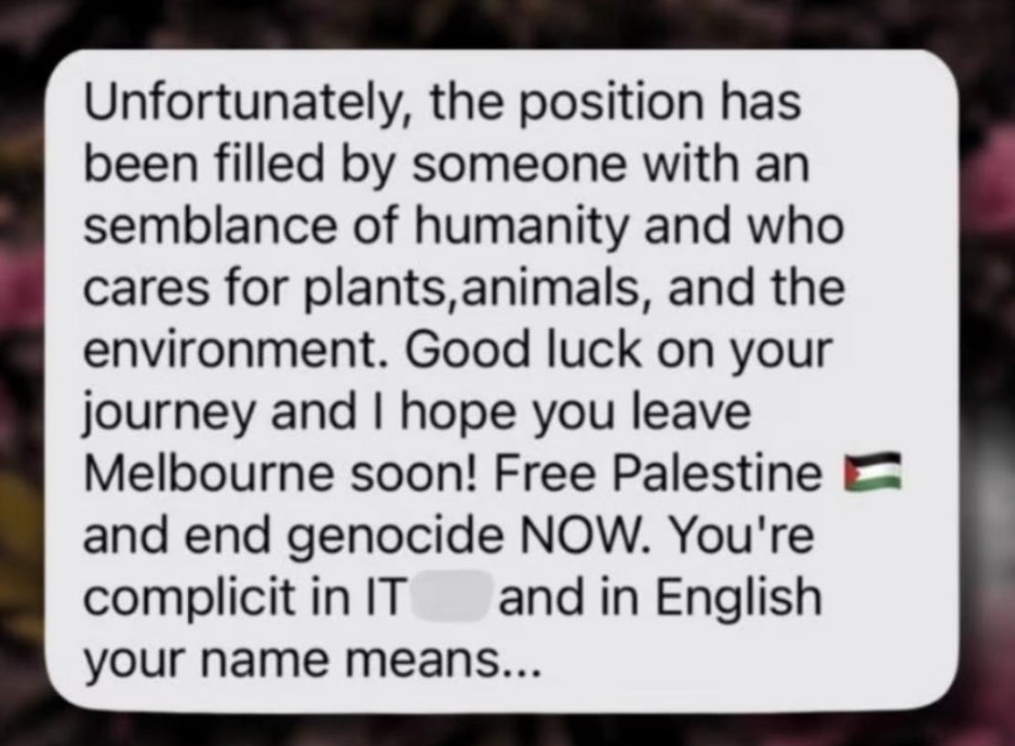 A 24-year-old Israeli woman was rejected from a job at a Melbourne nursery with a text message telling her she lacked “a semblance of humanity,” was “complicit” in genocide, and should leave Melbourne, with the owner adding “Free Palestine and end genocide NOW”.