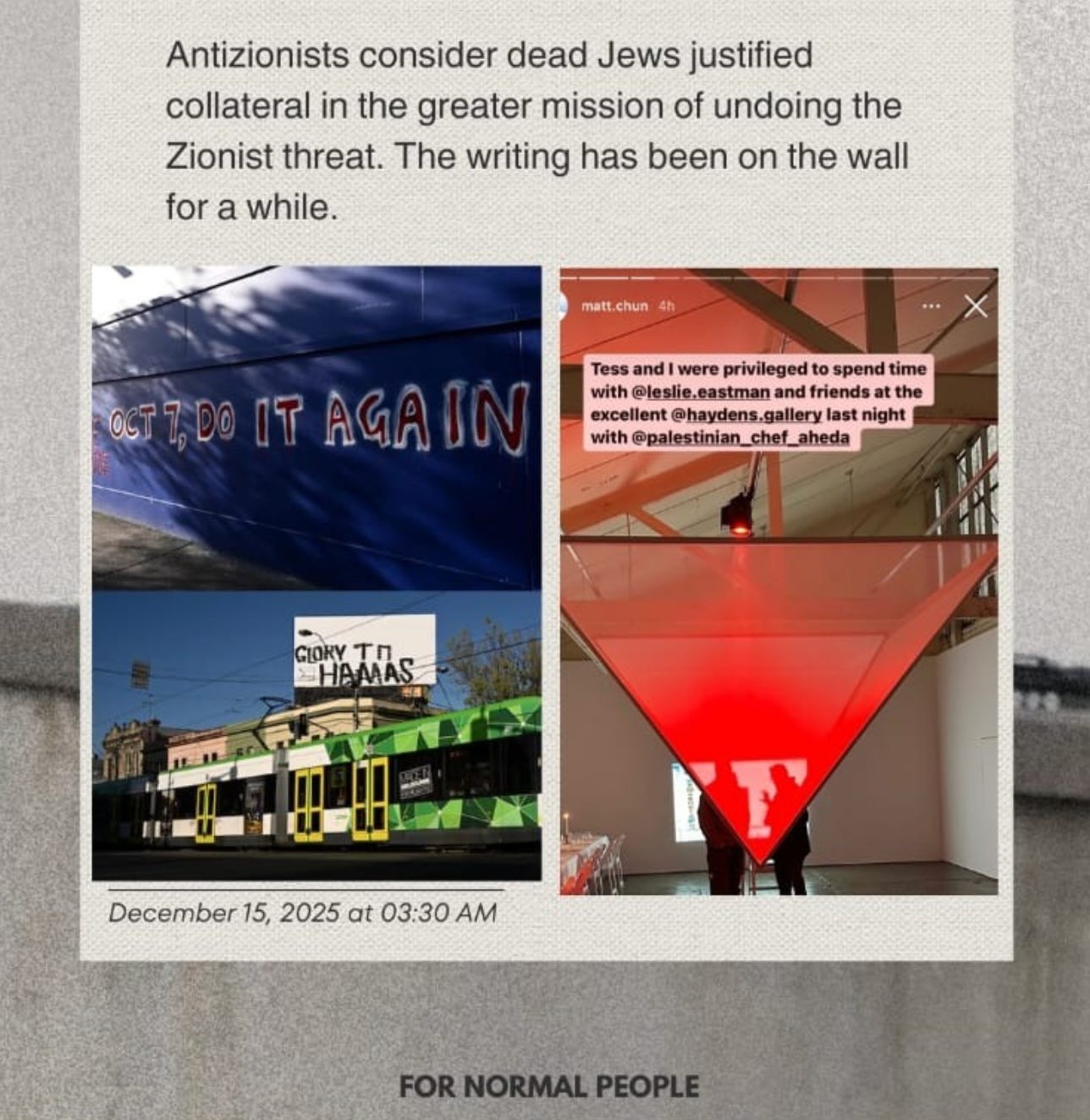 We still have Holocaust survivors alive today (one was tragically a victim of the Bondi attack). People with numbers tattooed on their arms. People who watched their families murdered. And now, in 2024 and 2025, Jewish people are being attacked in Australia, Europe and the US, being told it’s justified because of Israel’s actions in Gaza.