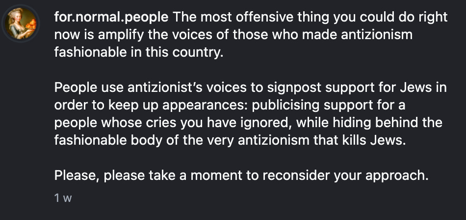 Sure, I’m aware there are anti-Zionist Jews, but that’s not my point. My point is it’s not up to non-Jews to decide the conditions under which other Jews are allowed to express their identity, heritage, or connection to Israel without being demonised.