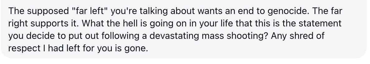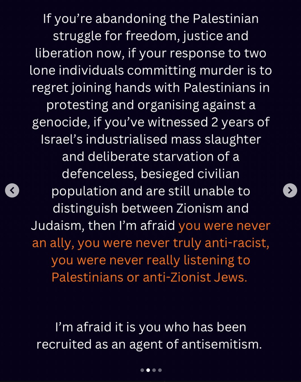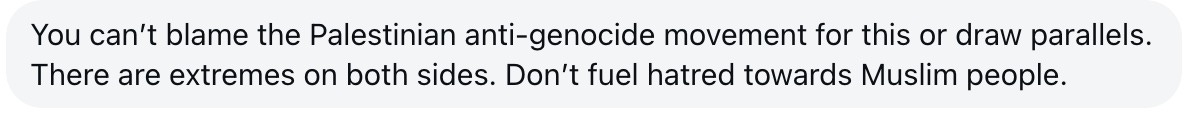 I’m not criticising the plight of civilians caught in tragedy. I’m criticising the movement’s failure to adequately condemn antisemitism within its ranks, the intellectual dishonesty of erasing Hamas’s responsibility, and the dangerous logic that treats hatred toward Jews as an inevitable or justified response to events thousands of miles away.