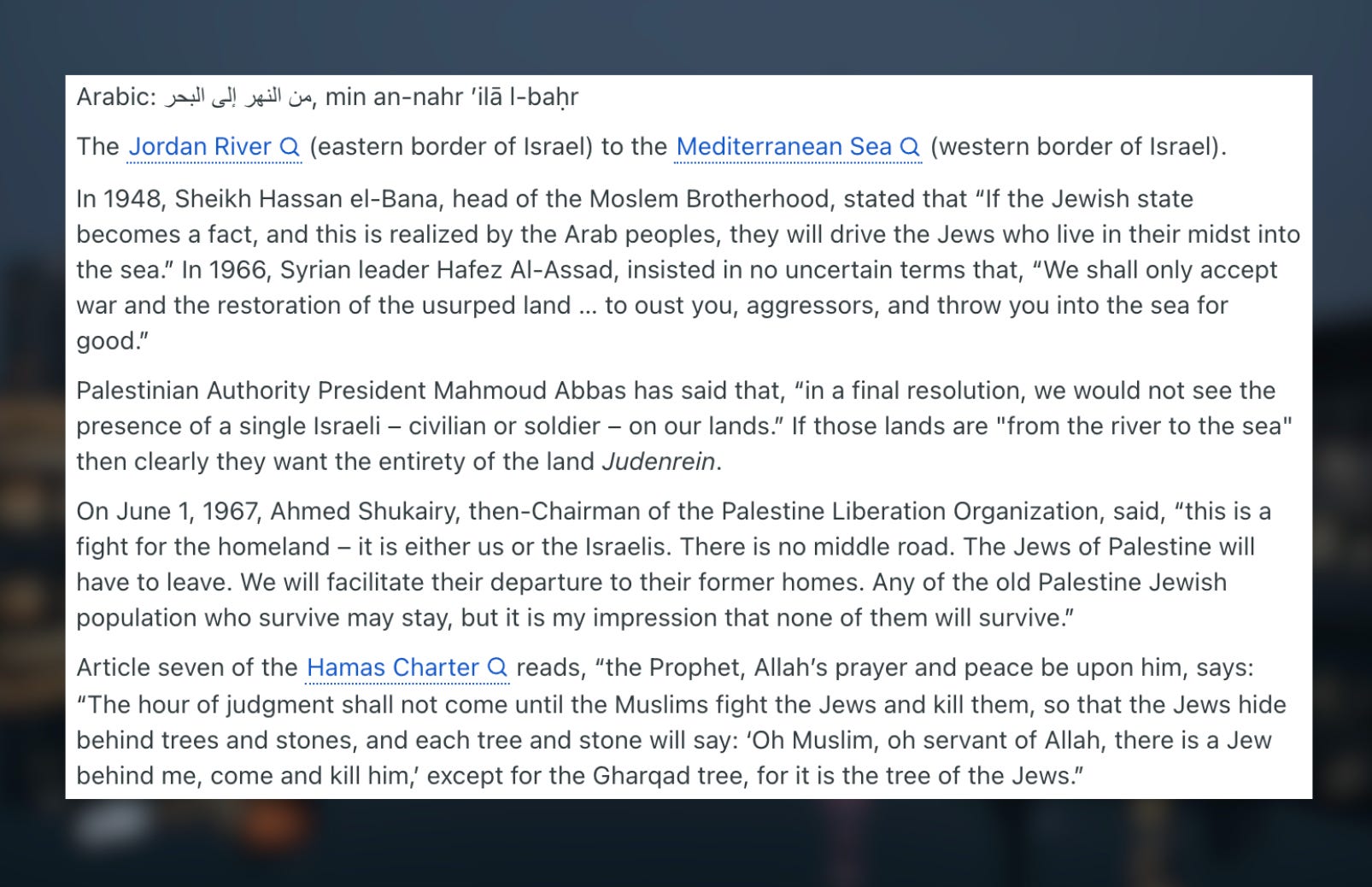 Same with the phrase “From the River to the Sea”, sometimes coupled with “by any means necessary” which supporters insist is merely geographical, with no antisemitic implications. This phrase has been consistently used to advocate for Israel's eradication and the removal of Jews from the region, a genocide, the very thing advocates claim to oppose. I’m not buying it.